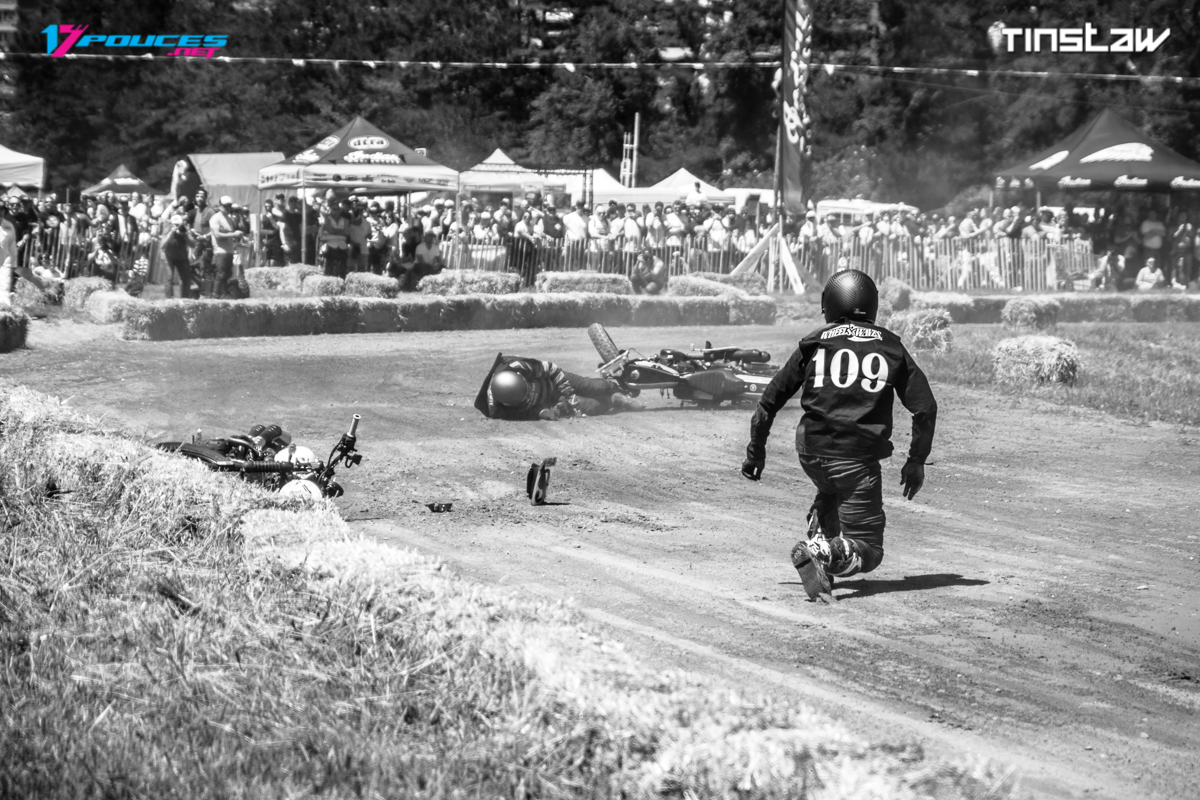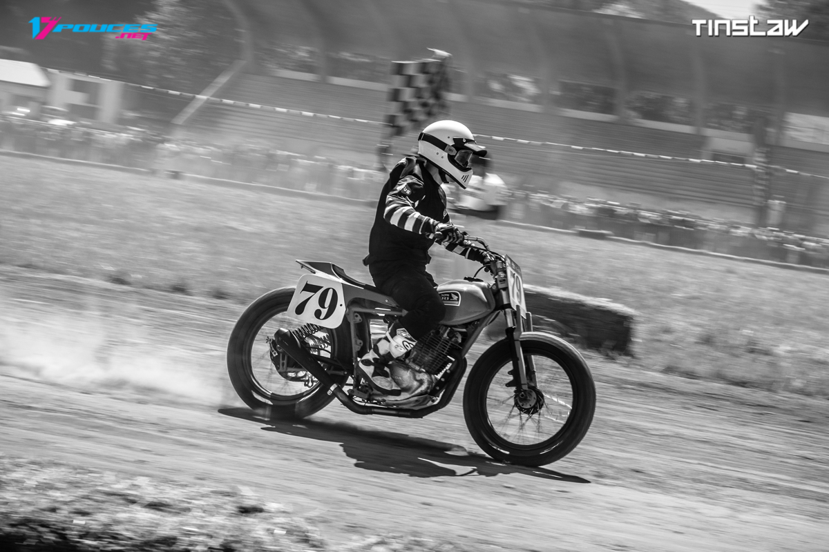 Le Flat Track, concrètement ça consiste à tourner en rond sur un anneau de terre battue avec une moto dépouillée à l’extrême. Les courses réunissent entre 4 et 8 pilotes et l’anneau peut faire 400, 800 ou 1600m. Née et popularisée aux Etats-Unis, la discipline est peu connue en France où il n’y a que 6 circuits répertoriés. En Espagne c’est déjà plus populaire, et les heureux participants à la dixième édition des 17’’ days se souviennent bien de leur session de Flat Track sur le circuit d’Aragon en 2012 !