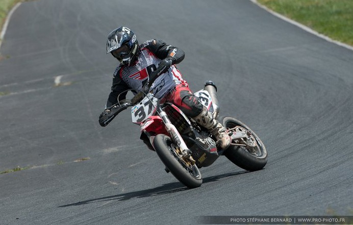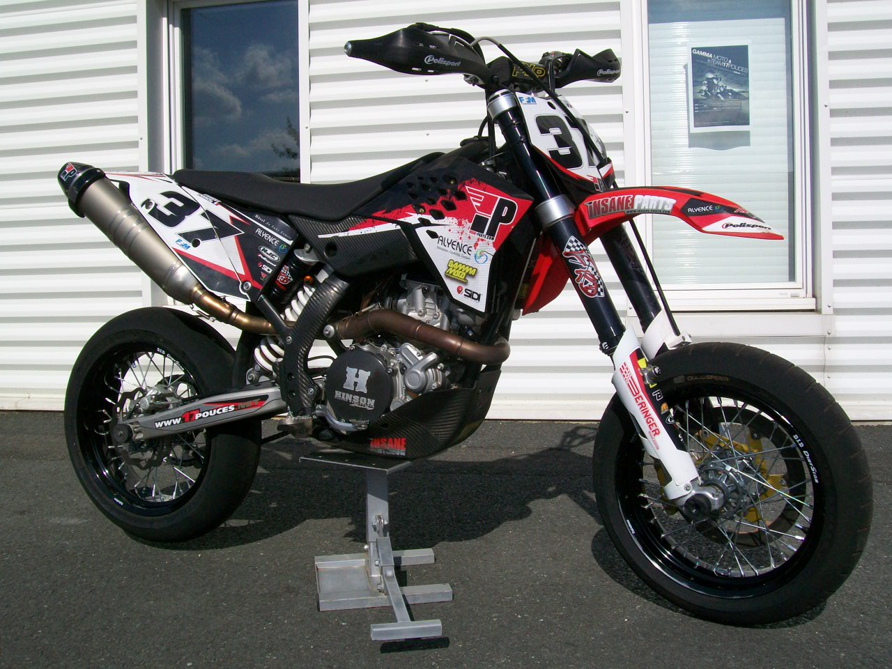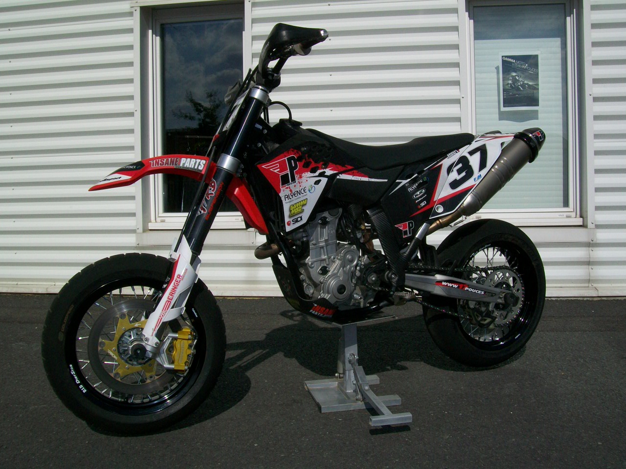 Préparé par David Lancelin de chez Gamma Moto (37 – Chinon http://www.gammamoto.fr/) bien connu des passionnés de Supermotard, ils sont partie sur une base de KTM 450 SMR 2009 avec des modifications moteur comme l’adoption d’une culasse modèle 2010 pourvue d’une meilleur lubrification,des arbres à came, d’origine KTM .Celle ci à été retravaillée dans les ateliers de chez FRD au niveau de l’admission, ainsi que le réalésage du carburateur Keihin en 43mm.