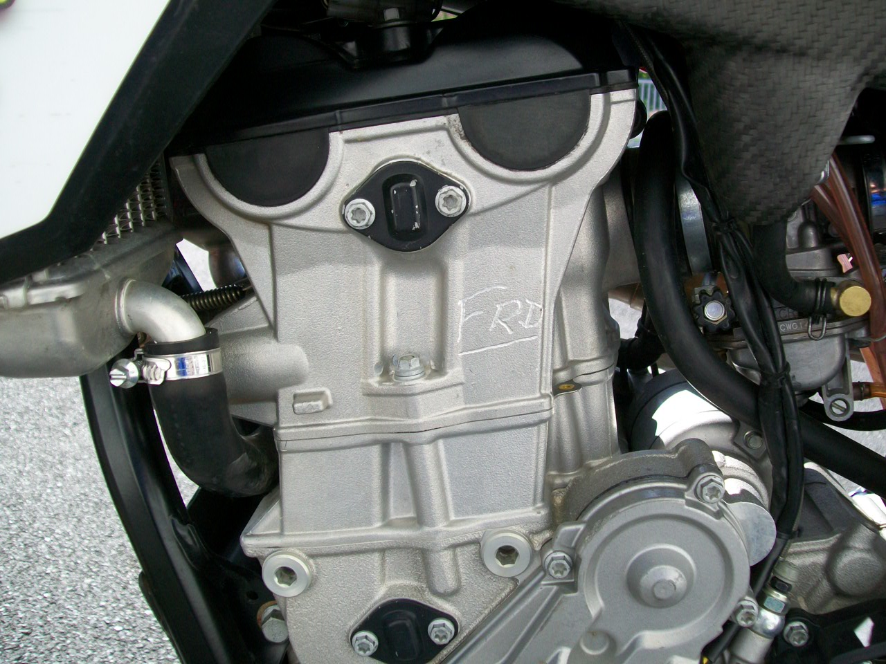 La culasse est montée sur un kit 505 de chez KTM avec une double ligne Doma qui permet de sortir 61.5CV à la roue du mono cylindre autrichien avec en plus un boitier CDI SXS spécifique, plus le kit pompe à eau gros volume de chez KTM pour mieux refroidir l’ensemble.