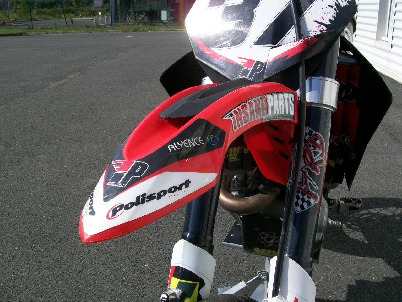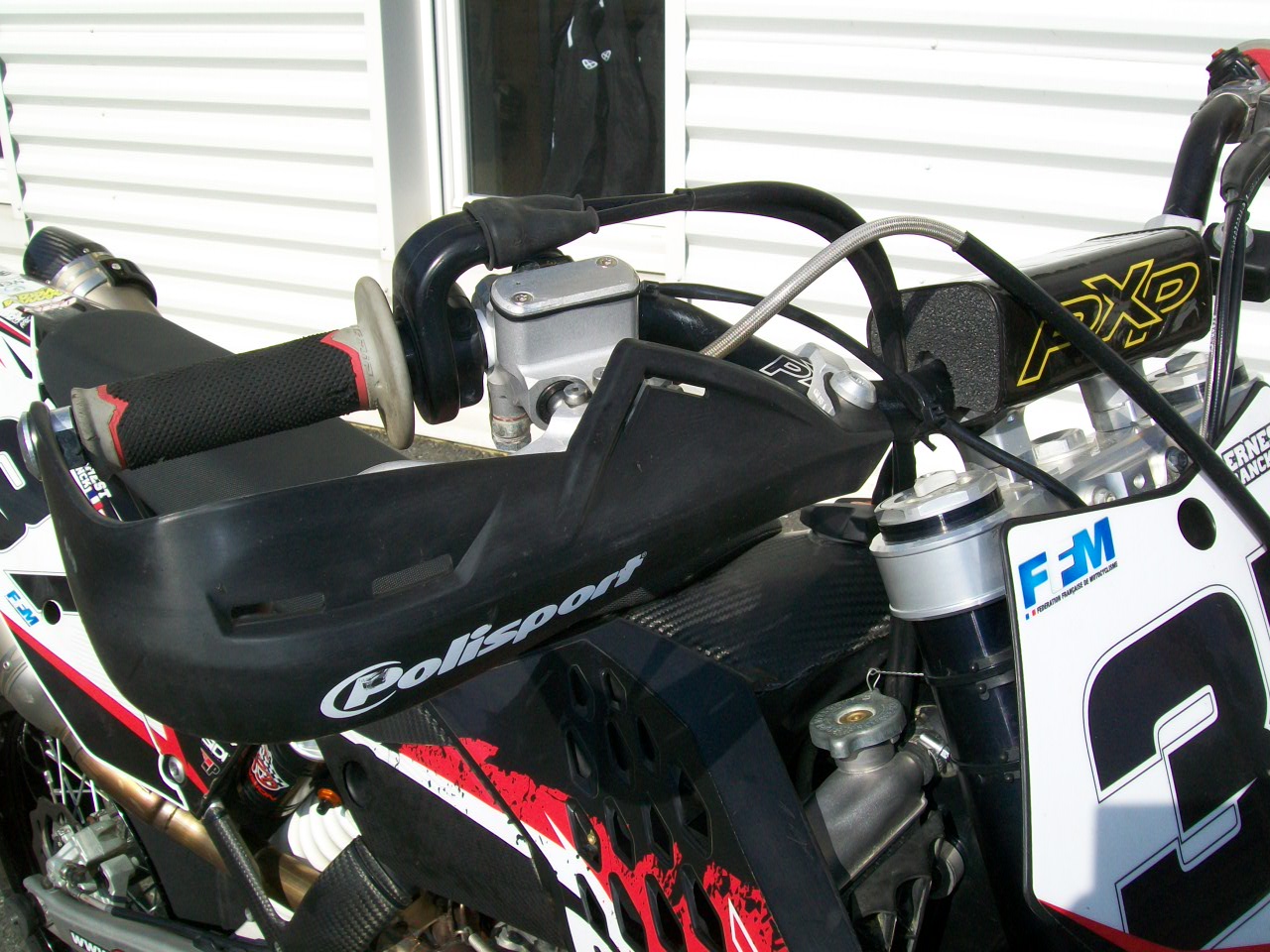 C’est Polisport qui équipe les guidon PXP en 28.6 de ses protège mains « Evolution » très éfficace en cas de chute, il nous l’on prouvé à mainte reprise ! Ainsi que le garde boue « Supermoatrd SM Line » avant avec son original entrée d’air qui diffuse sur les radiateurs.